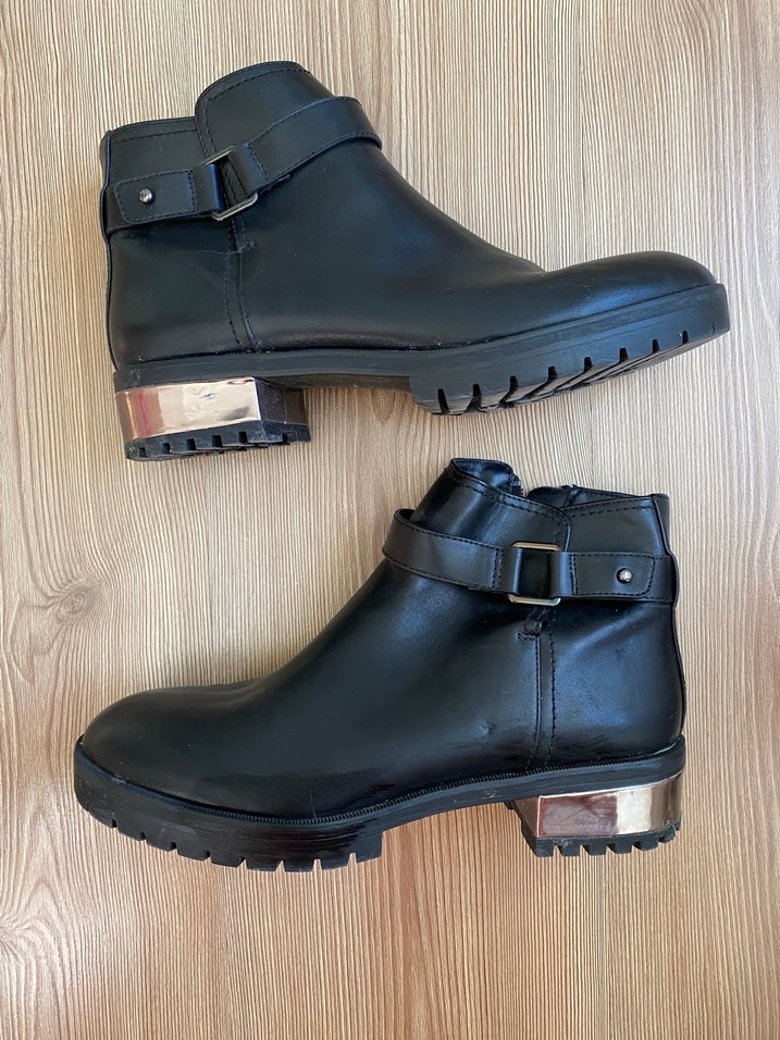 Siyah deri, tokalı ve blok topuklu biker tarzı kadın botları. Rahat ve günlük kullanıma uygun. bir kaç kez giymişimdir