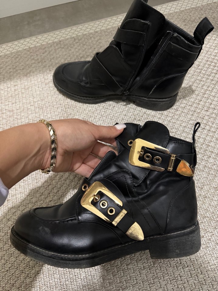 Siyah deri, altın tokalı ve blok topuklu botlar, günlük kullanım için desen içermeyen şık tasarıma sahip.