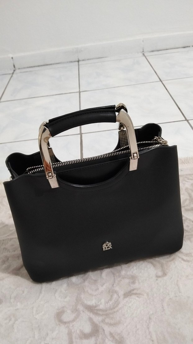 Siyah deri tokalı saplarıyla modern klasik tarzda, iş şıklığını yansıtan parlak yüzeyli kadın çantası. Günlük kullanıma uygun.