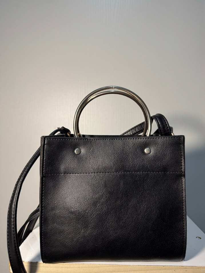 Minimalist tasarımlı, tokalı, metal halka saplı siyah deri kadın çantası. Günlük kullanıma uygun çağdaş stil.