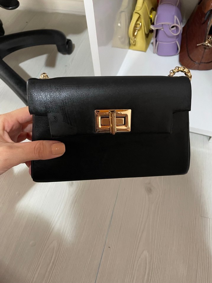 Siyah deri, baskılı ve tokalı kadın çantası modern klasik tarzda, Paris esintili, günlük kullanıma uygun.