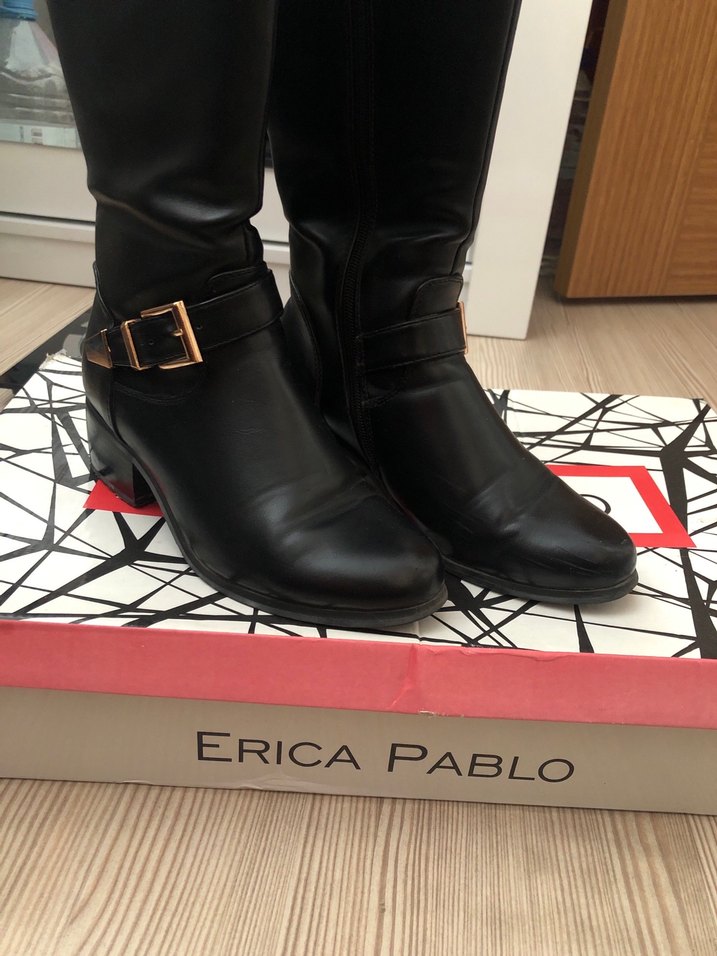 Siyah suni deri çizme kalın topuk ve tokalı detaylarla trendy günlük sokak stiline uygun. Marka: Erica Pablo. Çok rahat kalıbı da rahat 36 no ama 37 de rahat olur