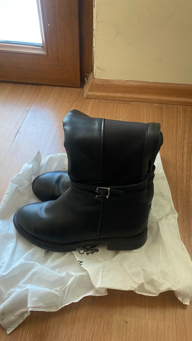 Siyah deri, tokalı ve blok topuklu dizüstü bot, rahat ve gotik tarzıyla günlük kullanıma uygun.
