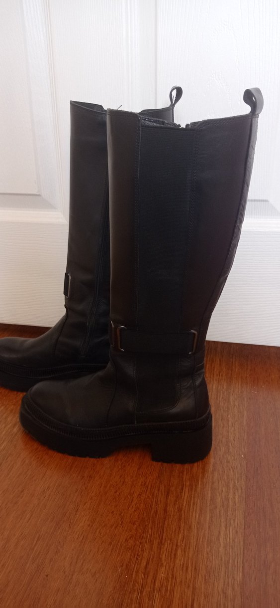 Siyah deri, tokalı dizüstü botlar. Platform topuklu, goth tarzında, sokak ve günlük kullanıma uygun. çok az kullanıldı hiçbir kusuru yok
