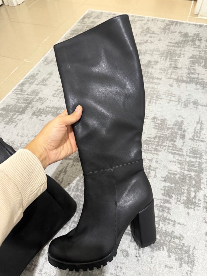 Siyah deri dizüsü çizme kalın topuklu ve tokalı, cesur minimalist gotik tarzda, günlük kullanıma uygun.