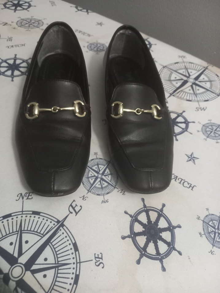 Siyah deri, tokalı ve blok topuklu kadın loafer ayakkabı, ofis kullanımı için klasik sokak stiliyle uyumlu.2.ci fotoda gosterdim ufak bir soyulma var. baska bir defosu yoktur