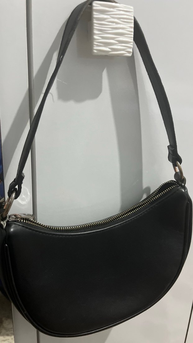 Siyah deri, tokalı askılı, minimalist tasarımlı kadın çantası, günlük kullanıma uygun.