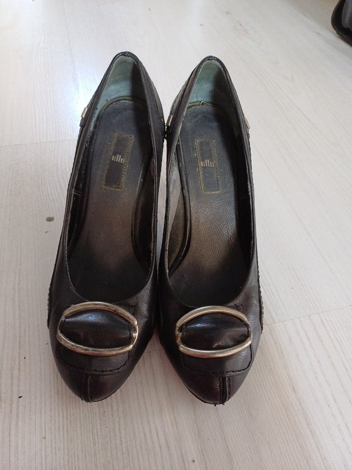 Siyah deri tokalı stilettolar, şık ve desen içermeyen tasarımıyla ofis için uygun. Gotik tarzda koyu renkte klasik topuklu ayakkabı.İç astarında beklemekten kaynaklı dökülmeler var kullanıma engel değil.