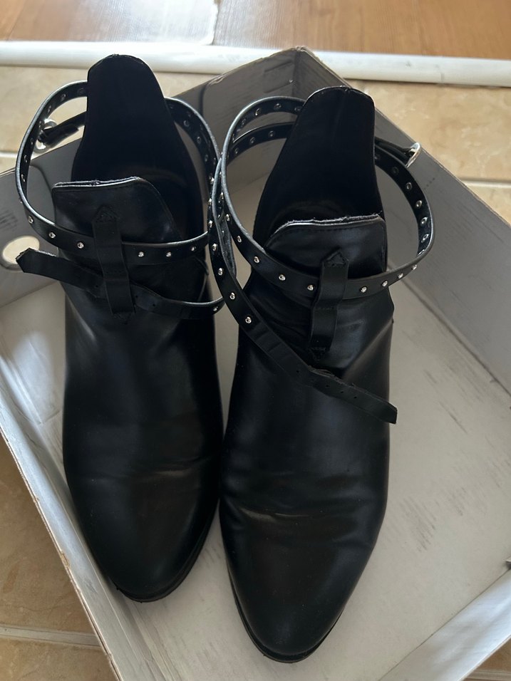 Siyah deri kadın botlar, tokalı kayışlar ve kalın topuklu. Parisli gotik tarzından ilham alır, desen içermez, günlük kullanıma uygundur.