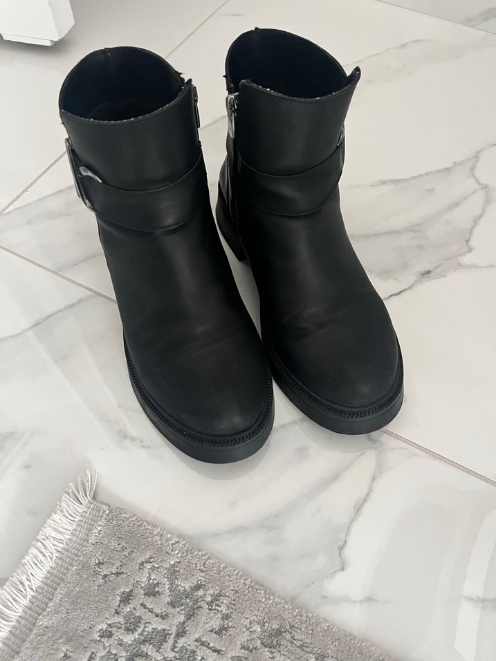 Siyah deri kadın botları, tokalı ve kalın topuklu, minimalist gotik tarzda günlük kullanıma uygun. Sol ayaktaki tokası düşmüş.