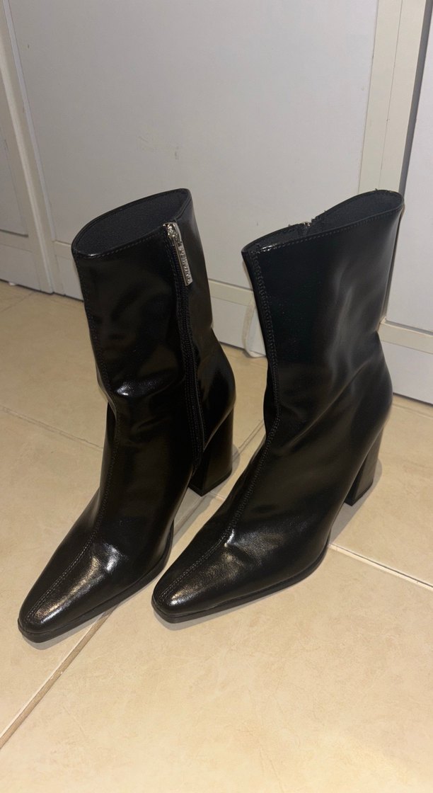 Siyah deri kadın botları, blok topuklu, tokalı ve fermuarlı, cesur gotik tarzda, günlük kullanım için uygun. Yan tarafında ve topuk kısmında ufak silik gözükecek şekilde bir deformemesi var ama ayakkabı sadece bir  kez kullanıldı hoşuma gitmediği için satıyorum