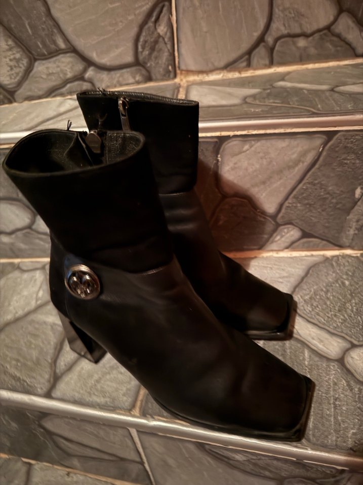 Siyah deri, tokalı ve blok topuklu kadın botları. Gotik tarzda, günlük kullanıma uygun, rahat ve şık.