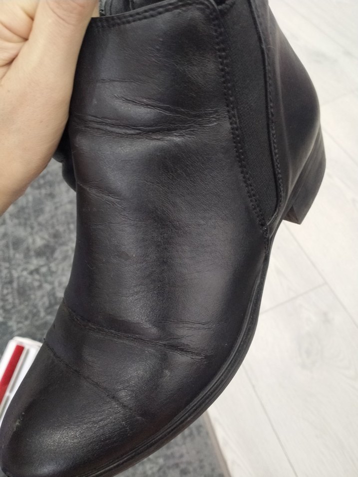 Siyah deri kadın botları, blok topuklu ve tokalı detaylı, günlük kullanıma uygun düz yüzeyli.
