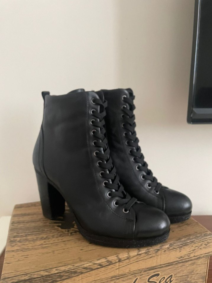 Siyah deri kadın botları, kalın ve yüksek topuklu ve bağcıklı detaylara sahip, romantik bir gece için goth tarzını yansıtıyor. Özdilek'ten alındı ve birkaç kez kullanıldı. Çok iyi durumda