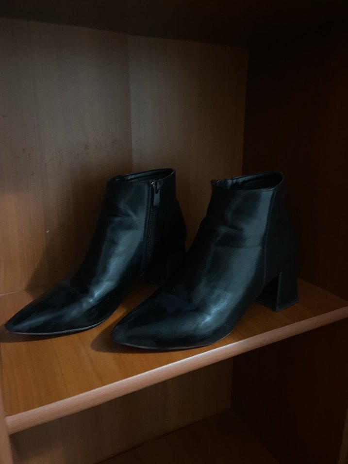 Siyah deri, topuklu kadın botları. Minimalist, goth tarzıyla ofis kullanımı için uygundur önünde biraz derisi kalktığı için oldukça uyguna veriyorum