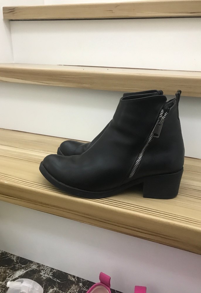 Kadınlar için siyah deri, tokalı ve kalın topuklu bot. Minimalist ve normcore tarzlara uygun, günlük kullanıma uygun şık bir model. Giyilmiştir. Marka TEMSİLİDİR