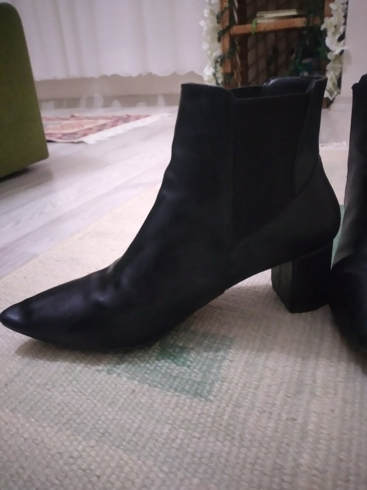 Severek kullandım artık ayağıma olmadığı için satıyorum. Derisinde sıkıntı yok. Kullandığım için haliyle topukta uç kısımda aşınma mevcut belli olmuyor fotoğrafta gözüktüğü gibi. Çok rahat. Siyah deri kadın botları, blok topuklu ve tokalı detaylara sahip, minimalist gotik tarzıyla günlük kullanıma uygun.