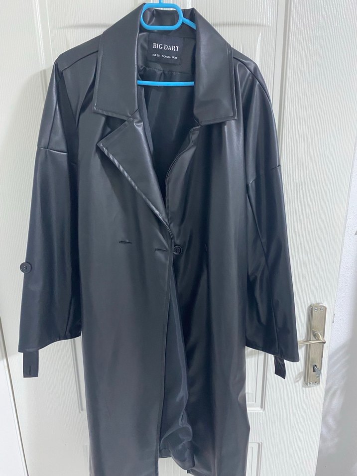 Bu siyah deri uzun kaban, belden kemerli ve yakası kesik detaylı, bol kesimiyle sokak modasına uygun ve günlük kullanıma elverişlidir.