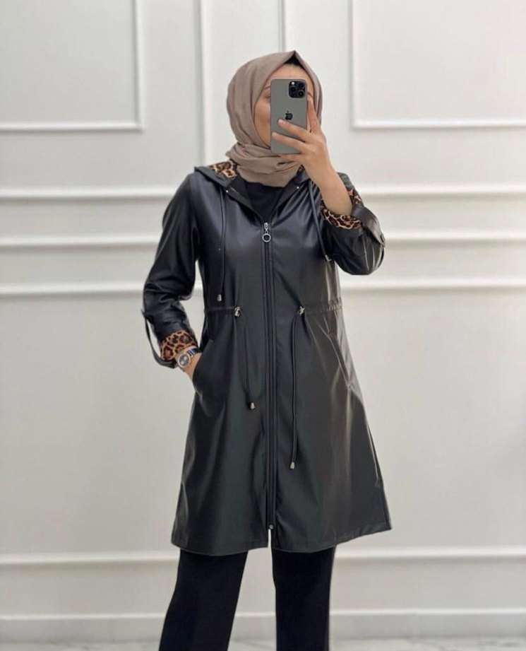 Sıfır Ürün Kadın siyah deri uzun yağmurluk, kapüşonlu ve bol kesimdir. Leopar desenli kollarda ve kapüşonda yer alır, günlük sokak stiline uygundur.