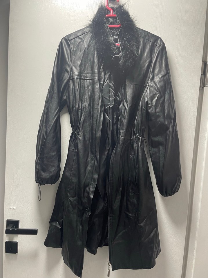 Siyah deri, uzun kesim ve kürklü detaylı, uzun kollu, kesimli kadın ceketi. Gotik tarzda, günlük kullanıma uygun.