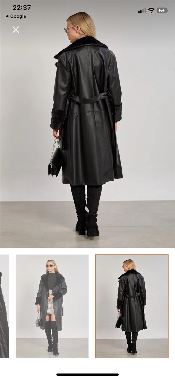 Kadın siyah deri uzun trençkot,kürk detaylı ve kesik yakalı