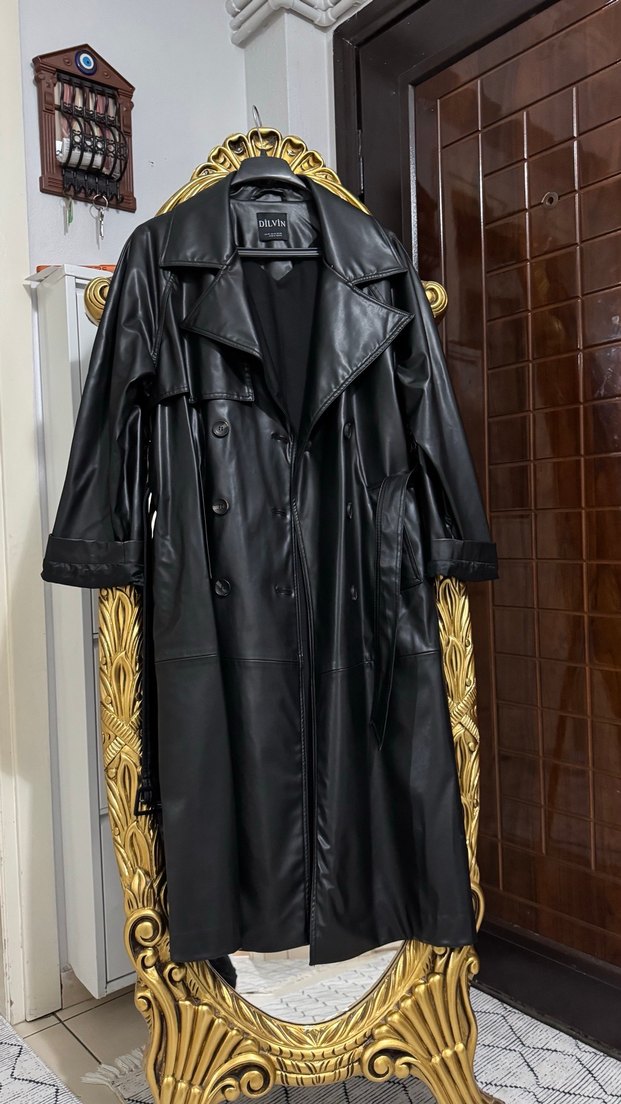 Siyah deri uzun trençkot, keskin yakalı ve kemerli. Askılı kolları ve normal kesimiyle ofis için klasik gotik tarz sunar.