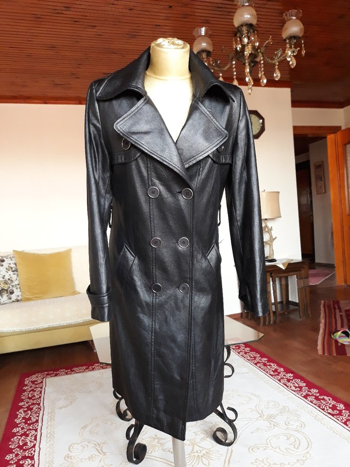 Siyah deri uzun trençkot, düğmeli ve yaka detaylıdır. Klasik gotik tarzda ofis için uygun, düzenli kesim ve kayışlı kollara sahiptir.