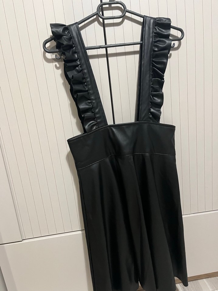 Siyah deri uzun tulum, straplez yaka ve fırfırlı askılarla gotik ve trend bir tarz sunuyor. Günlük kullanım için uygun.