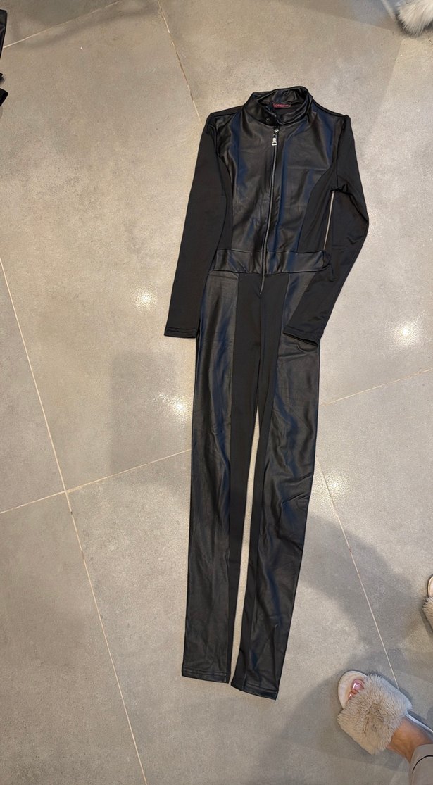 Siyah deri uzun tulum, yüksek yaka, kemerli bel ve ince askılı kol detaylarıyla, ofis için modaya uygun ve avangart bir tarz sunar.