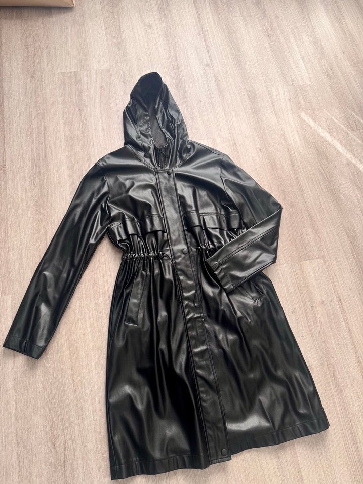 Siyah deri, kemerli ve kapüşonlu uzun yağmurluk. Geniş kesim, uzun kollu ve çentikli yaka detaylarıyla gotik sokak stili sunar. Günlük kullanıma uygun.