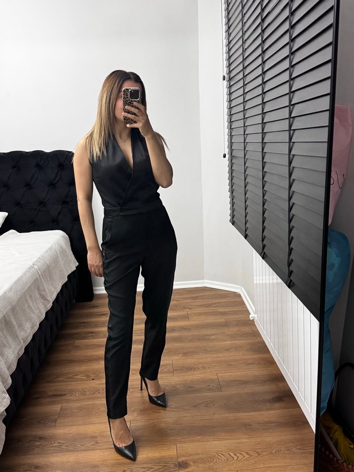 Siyah deri tulum, V yakalı ve askılı kollu, modern ve cesur görünüm sunar. Ofis için uygun, normal kesim ve midi boyda.