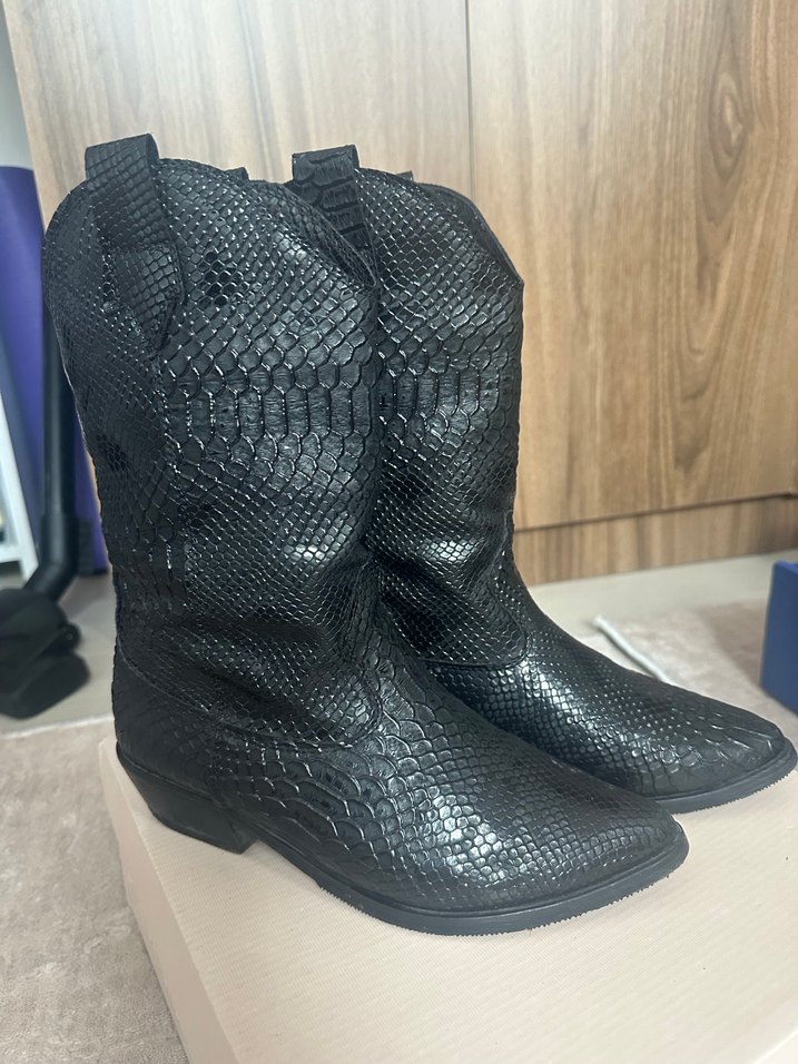 Siyah deri yılan desenli kadın botları, kalın topuklu ve kemerli detaylıdır. Bohem ve retro tarzıyla günlük sokak modasına uygundur. Sivri burun kovboy çizme çok rahat