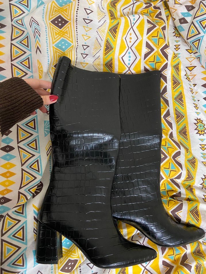 Siyah deri yılan desenli, topuklu ve tokalı kadın diz boyu çizmeler. Bohem ve retro tarzda günlük sokak giyimine uygundur.