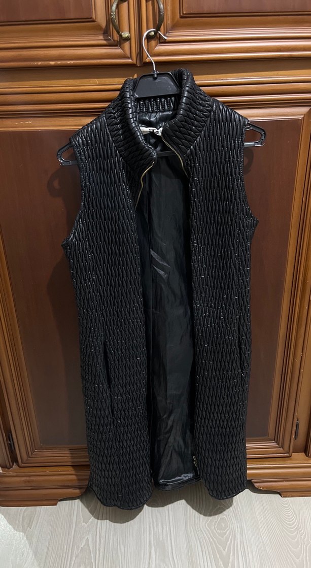 Siyah deri, yılan desenli, pileli uzun yelek. Kolsuz, yüksek yakalı ve rahat kesim, sokak modasına uygun.