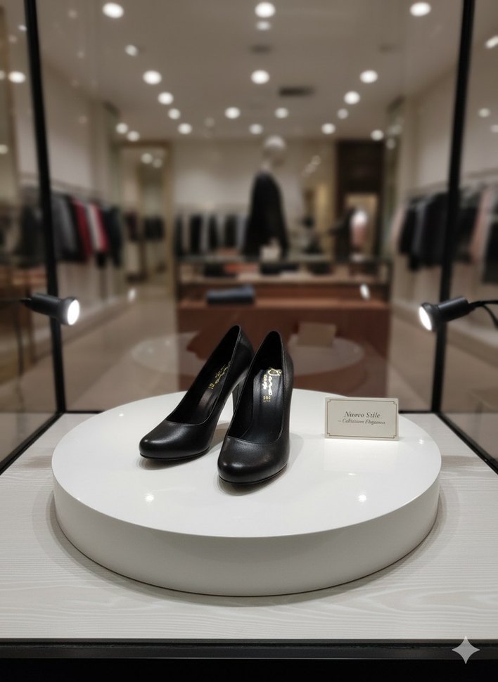Siyah deri yüksek topuklu ayakkabılar, parlak yüzey ve baskılı desenle ofis için çağdaş ve klasik bir şıklık sunar.