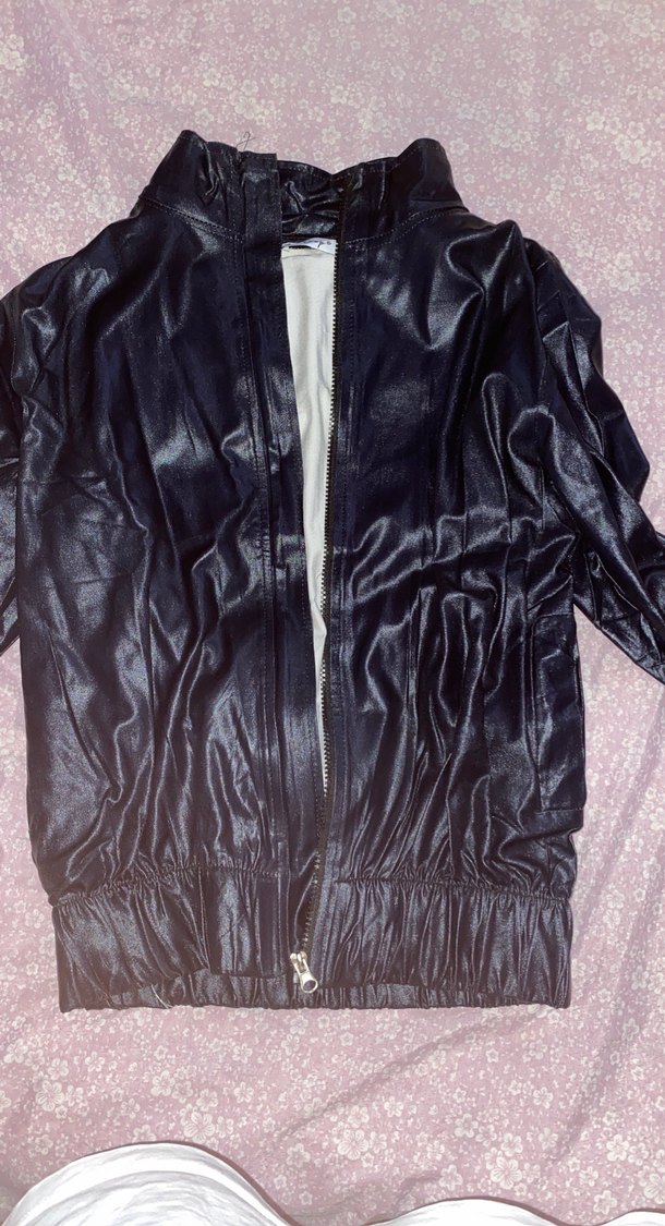 Siyah deri, yüksek yakalı ve fermuarlı bu kadın ceketi, vücuda oturan midi boy ve uzun kolludur. Gotik ve grunge punk tarzına uygundur.