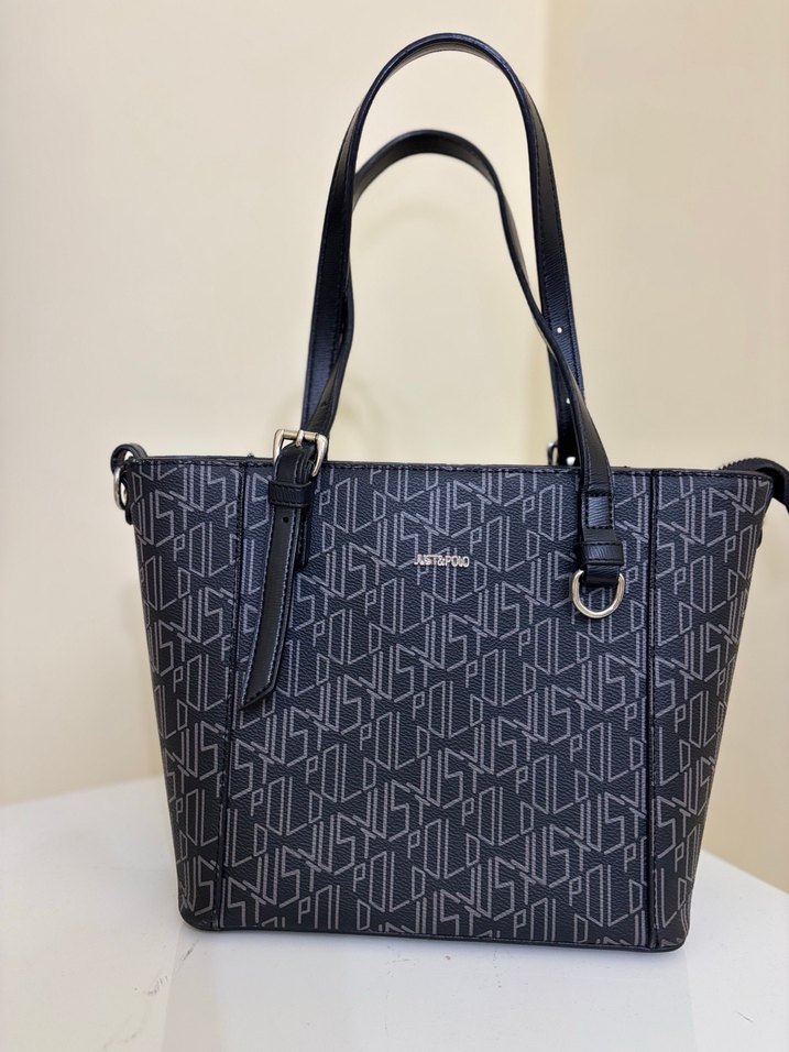 Kadınlar için siyah ve gri desenli sentetik kumaştan kemerli çanta. Günlük iş ortamlarına uygun çağdaş tarzda.