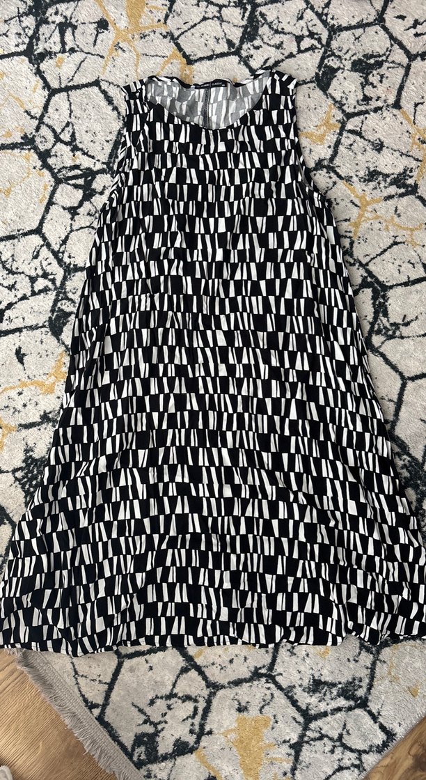 Kadınlar için uzun, pilili ve desenli yazlık elbise. Siyah-beyaz renklerde, kayık yaka ve ince askılıdır. Salaş kesimi ve çağdaş avant-garde tarzı sunar.