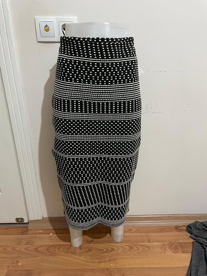 , desenli, uzun kalem etek. Örme kumaştan, pilili ve vücuda oturan kesime sahip, günlük kullanıma uygun.