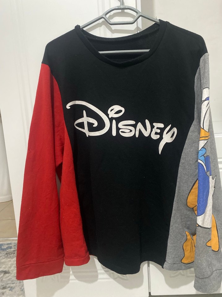 Kadınlar için uzun kollu, siyah, kırmızı ve gri renk bloklu Disney baskılı sweatshirt. Pamuklu örme kumaştan, rahat kesim ve bisiklet yaka. Günlük kullanım için uygundur.