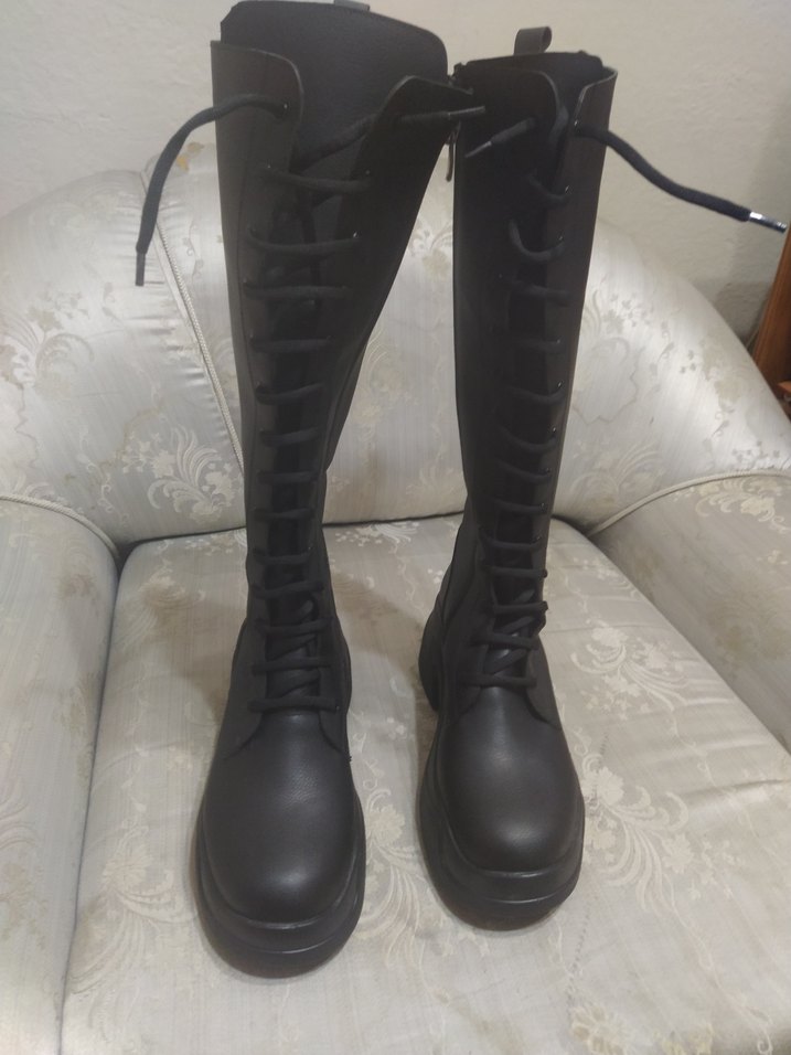 Siyah dizüstü gotik çizme, stiletto topuklu ve tokalı, kauçuk malzemeden üretilmiştir. Modaya uygun ve avangart tarz için ideal.