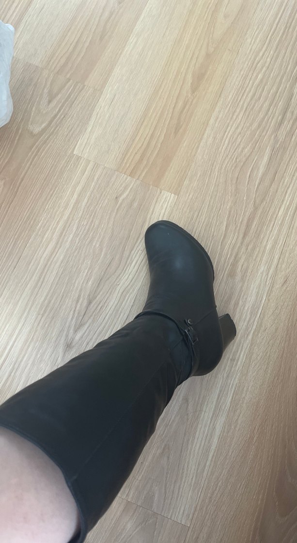 Siyah dizüstü bot, blok topuklu ve tokalı detaylıdır. Minimalist gotik tarzıyla günlük kullanıma uygundur. Bacak kalınlığı ince olanlar alsa daha iyi olur çünkü yukarı doğru darlaşıyor bunuda özbekistandan almıştım