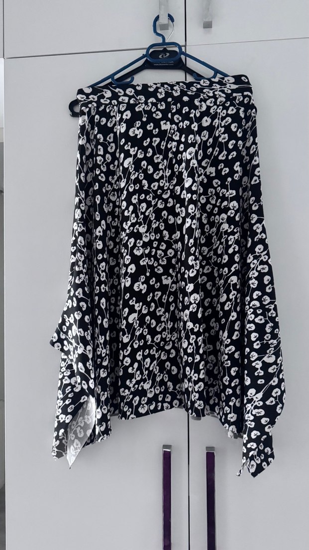 Kadınlar için siyah, beyaz batik desenli, dökümlü ve bol kesim midi etek, sentetik kumaştan üretilmiştir.