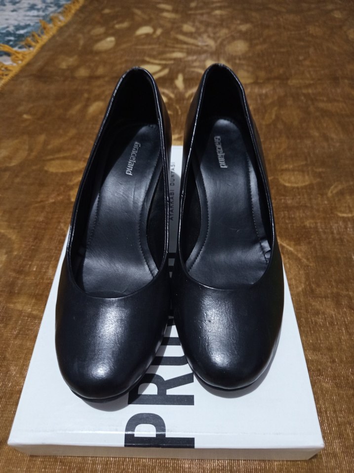 Siyah dolgu topuklu, desenli olmayan yüzeye sahip, rahat ofis kullanımı için kauçuk tabanlı kadın klasik ayakkabı. Minimalist ve zahmetsiz şıklık sunar.