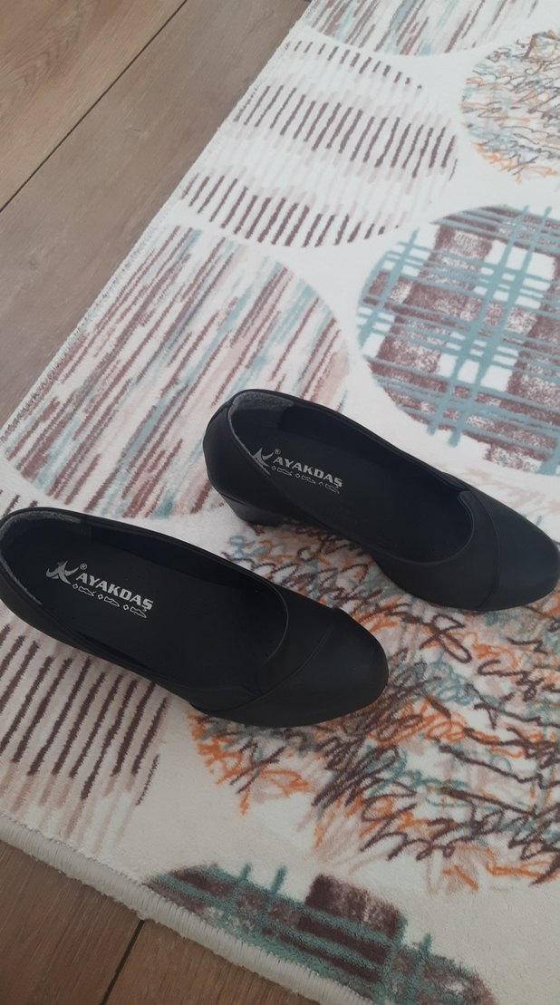 Siyah dolgu topuklu, baskılı desenli ve cırt cırtlı kauçuk malzemeden yapılmış günlük iş kullanımı için uygun ayakkabı. Marka: AYAKDAŞ.