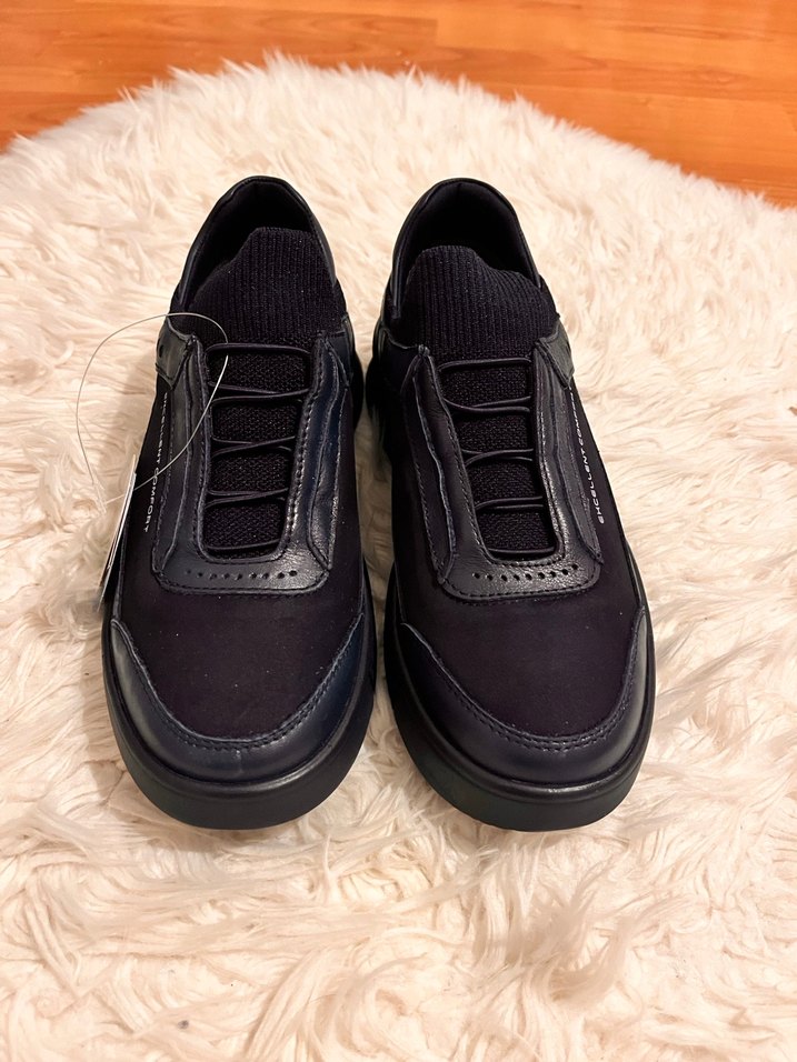 Kadınlar için siyah, dolgu topuklu ve bağcıklı spor ayakkabı. Kauçuk malzemeden üretilmiştir, günlük sokak stili için uygundur.