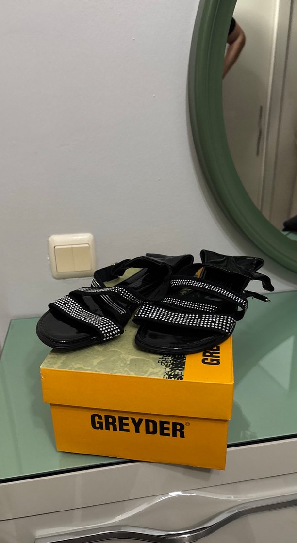 Siyah dolgu topuklu, bantlı ve baskılı detaylara sahip kauçuk kadın sandalet. Sokak stili ve açık hava için uygundur. Marka: GREYDER.