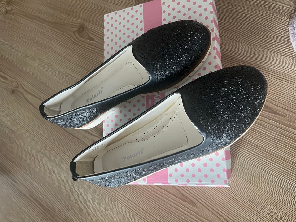 Kadınlar için dolgu topuklu, düz, siyah dokulu kauçuk ayakkabılar. Günlük kullanım için rahat. İç kısmında Polaris yazısı bulunur. Hiç giyilmedi