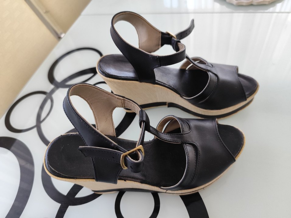Siyah dolgu topuklu, tokalı kauçuk kadın sandalet. Minimalist ve klasik tarzda, günlük kullanım için uygundur.