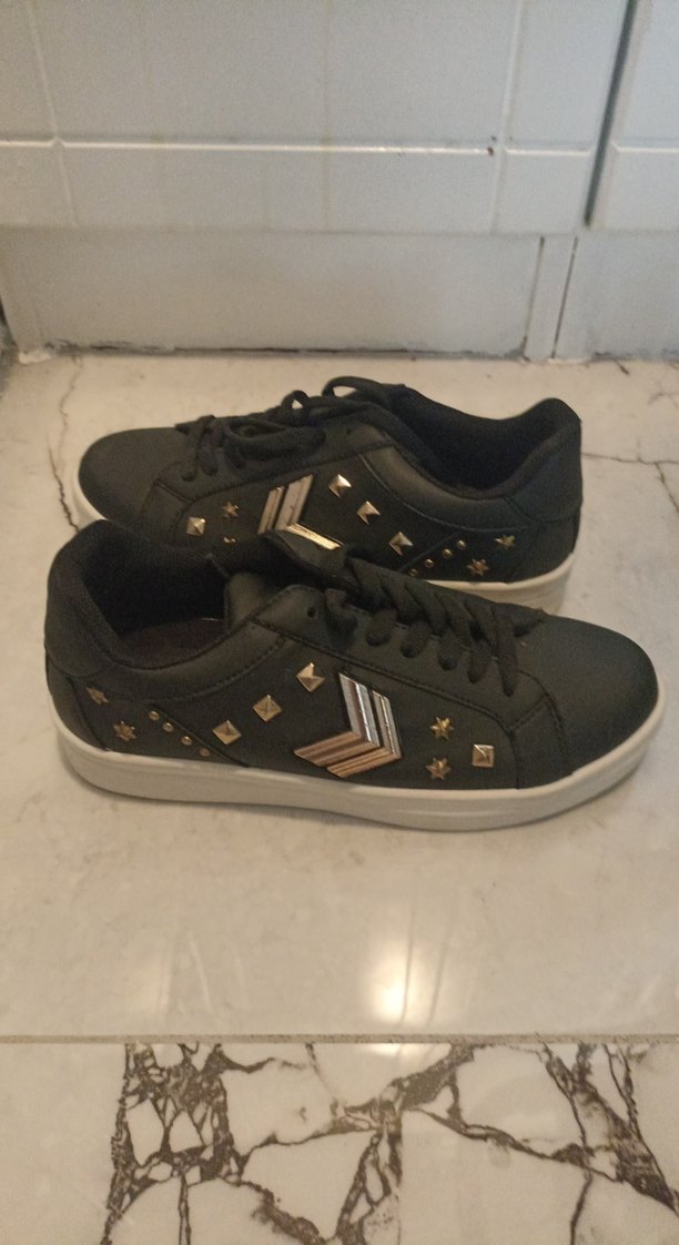 Siyah dolgu topuklu, tokalı ve desenli spor ayakkabılar, sportif sokak tarzına uygundur.